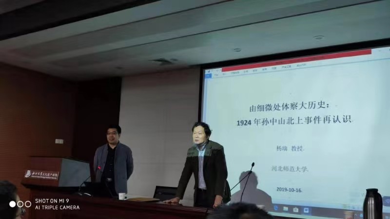 10月16日下午,河北师范大学历史文化学院杨瑞教授应邀做客我校“名家讲坛”,在太白校区博望报告厅为我校师生做《由细微处体察大历史-1924年孙中山北上事件再认识》专题讲座。讲座由新葡萄8883官网AMG院长陈峰教授主持,中国近代史教研室的教师及各专业研究生、本科生到场聆听。