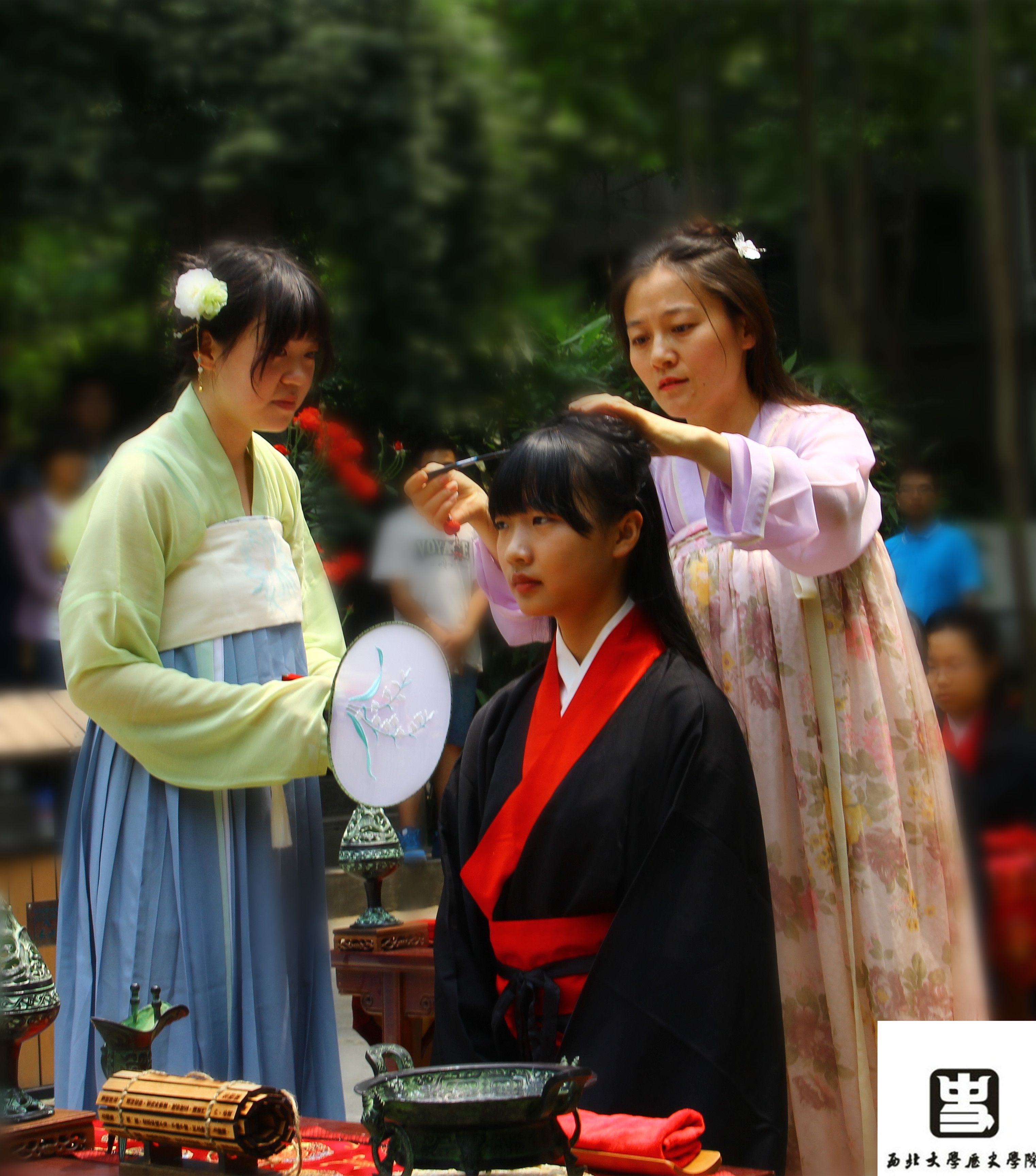 中国传统成人礼分为给成年男子的冠礼和给成年女子的笄礼。具体方式是由长者给男子加冠,女子结髻插簪。由装束的变化来彰显成年之后的不同,也是传统礼仪文化中非常重要的一环。