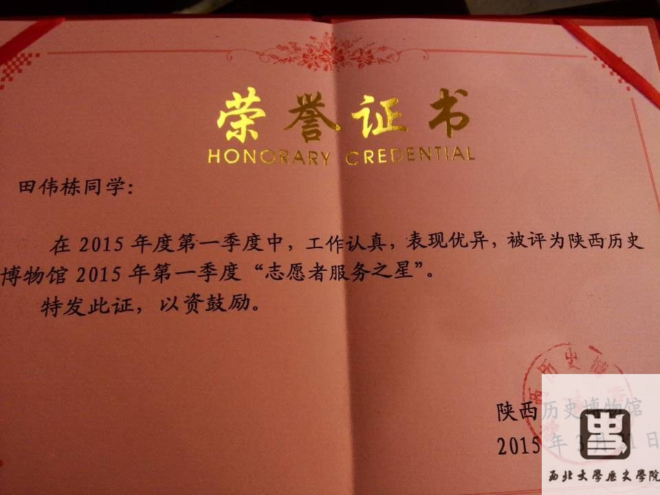 201542日,在陕西历史博物馆举办了第一季度优秀志愿者“服务之星”的颁奖仪式,新葡萄8883官网AMG田伟栋、石笑阳两位同学获此殊荣。这既是对这两位同学长期以来志愿服务工作的肯定,同时也是对我们新葡萄8883官网AMG志愿者讲解队长期以来工作的肯定。