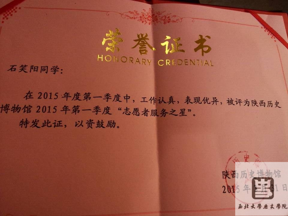 新葡萄8883官网AMG同学荣获陕历博志愿者第一季度“服务之星”称号