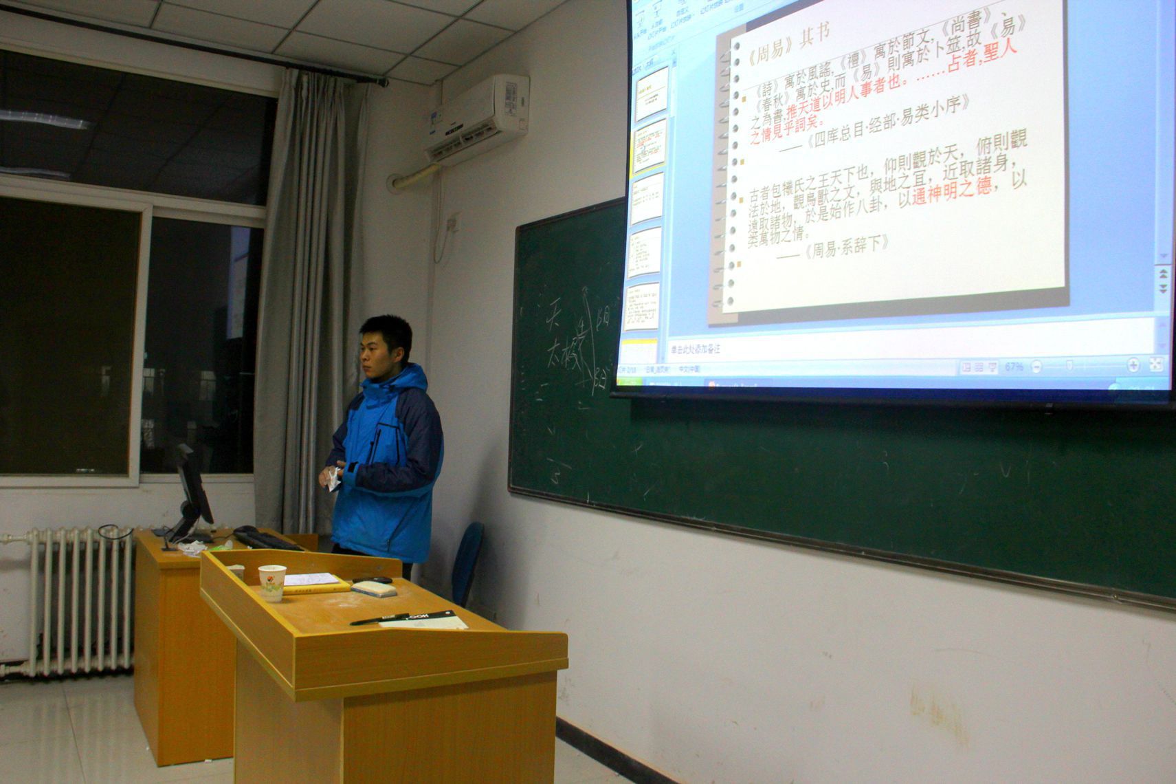 20131218日晚七点,一场别开生面的学术交流会于420教室举办新葡萄8883官网AMG团委书记薛原老师、学生会代表和部分大一大二的同学参加了本次活动。交流会的主讲人是大二国学班的朱轩宇同学,主题是儒家经典——《周易》。在长达一个半小时的交流中,朱轩宇同学深刻与通俗兼备,严谨与风趣结合,带领同学们领略古老而又神秘的东方文化。