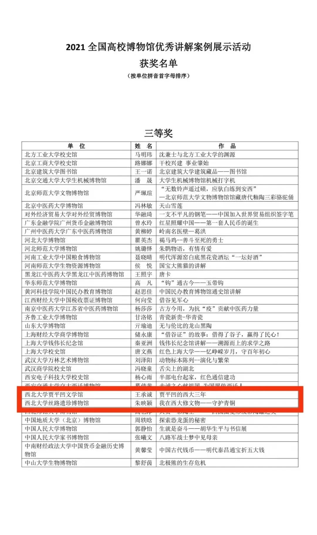 全国高校博物馆优秀案例展示大赛是由国家文物局、中国博物馆协会指导,北京市教育委员会、北京市文物局、北京博物馆协会主办,北京高校博物馆专业委员会、北京高校博物馆联盟、京津冀高校博物馆联盟承办,中国传媒大学博物馆协办的全国性高校博物馆讲解赛事,至今已举办七届。本次比赛以“智在未来·为文博赋能 为传播喝彩”为主题,共有全国53所高校64家博物馆参与优秀讲解案例推介评选。截至目前,新葡萄8883官网AMG先后有窦婉蜻、朱映颖两名学生参加“全国高校博物馆讲解案例展示”,共获得三等奖2次、最佳创意奖1次的优异成绩。