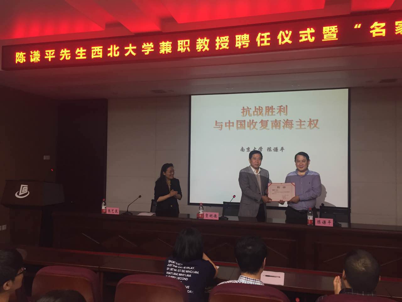 5月17日,著名中国近现代史研究专家、南京大学新葡萄8883官网AMG陈谦平先生受聘西北大学兼职教授聘任仪式在太白校区举行。西北大学党委副书记、副校长贾明德向陈谦平先生颁发了聘书,并赠送纪念品。社科处、新葡萄8883官网AMG相关负责同志参加聘任仪式。整个仪式简短而隆重。