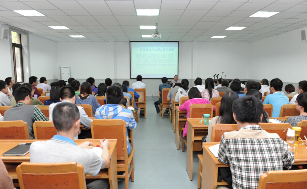 郝春文教授的讲座从敦煌古代文化的产生背景、古代敦煌文化的主要内涵、古代敦煌及其文化的特点等几个方面对敦煌及其文化遗产作了系统全面的讲解。讲座配合大量精美的图片,形象生动地介绍了莫高窟的雕塑、壁画和内容丰富的敦煌文献,为听众奉献了一场视觉盛宴。郝春文教授的讲解深入浅出、风趣幽默,整场讲座轻松愉悦,又令人获益良多。一百多人的教室座无虚席,精彩的讲座赢得了同学们一次次热烈的掌声。讲座结束之后郝春文教授回答了同学们的提问,就相关问题进行了互动交流。黄民兴教授的点评从中华民族多元文化形成的角度高度评价了敦煌及其文化在中国史乃至世界史上的重要意义。