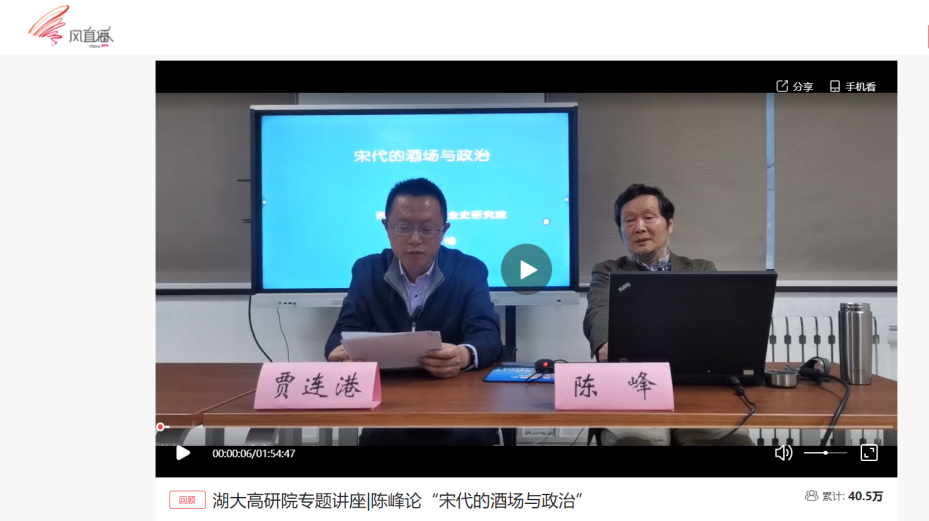 11月10日,湖南大学(岳麓书院)人文高等研究院(简称“高研院”)特邀西北大学宋辽金史研究院暨新葡萄8883官网AMG陈峰教授作客湖南大学“人文大家谈传统文化”专题讲座,线上主讲“宋代的酒场与政治”,贾连港副教授担任主持。凤凰网全程直播,在线听众达到40.5万人次。