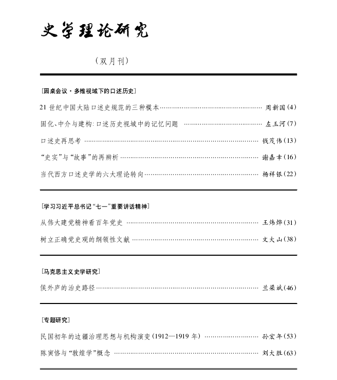 《史学理论研究》由中国社会科学院历史理论研究所主办,于1992年创刊,是目前国内唯一一份有关历史学理论与方法研究的专业性学术刊物。期刊以大力推进历史理论研究、积极回应重大历史与现实问题为己任,以加快构建中国特色历史学学科体系、学术体系、话语体系为目标,提倡贯通式、大历史、长时段的研究。