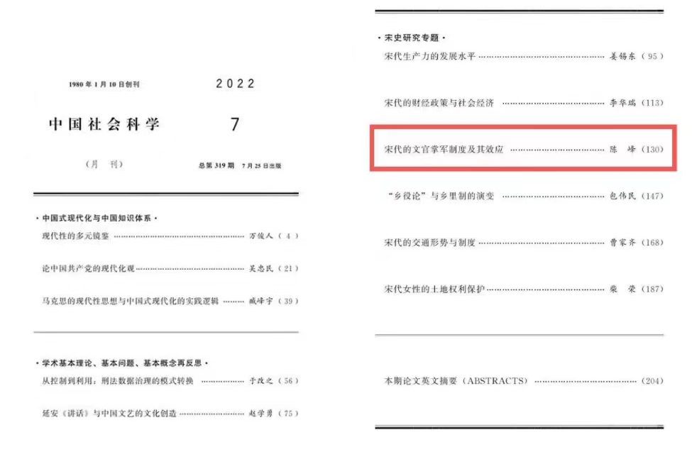 近日,新葡萄8883官网AMG陈峰教授在《中国社会科学》2022年第7期发表了专题论文《宋代的文官掌军制度及其效应》。该文是陈峰教授主持的国家“十四五”发展规划重大学术文化工程——“《(新编)中国通史》纂修工程”第八卷(辽宋夏金卷)的阶段性成果之一。这是今年新葡萄8883官网AMG在《中国社会科学》上连续发表的第二篇专题论文,是学校在中国历史研究方面取得的又一突破性进展,也是献给西北大学双甲子校庆的另一学术礼物。