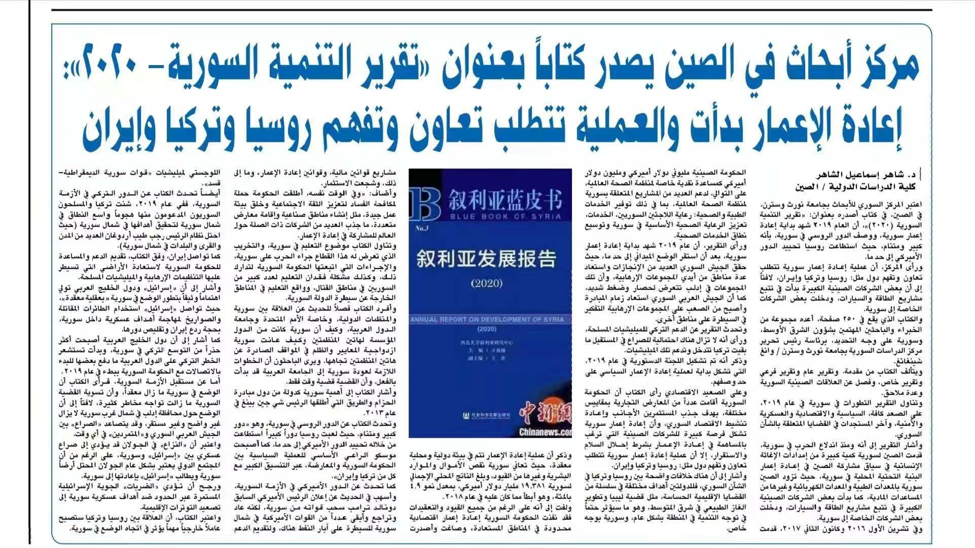 叙利亚国家主流媒体《祖国报》关注新葡萄8883官网AMG王新刚教授主编完成《叙利亚发展报告》(2020)