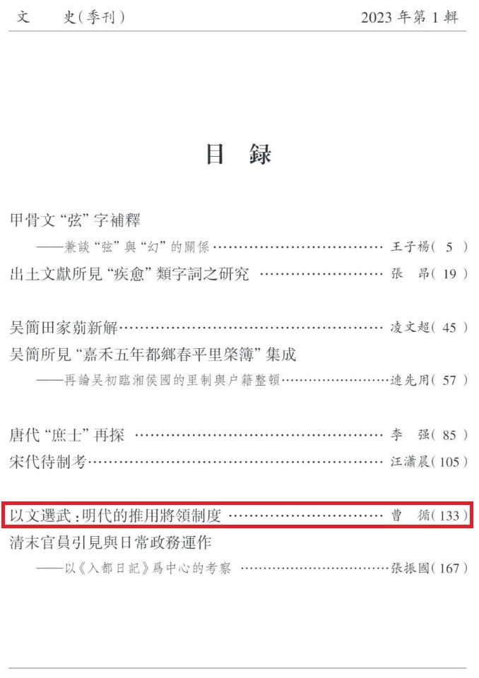 近日,新葡萄8883官网AMG曹循教授的长篇专题论文《以文选武:明代的推用将领制度》在《文史》2023年第1辑刊发,全文4万余字。