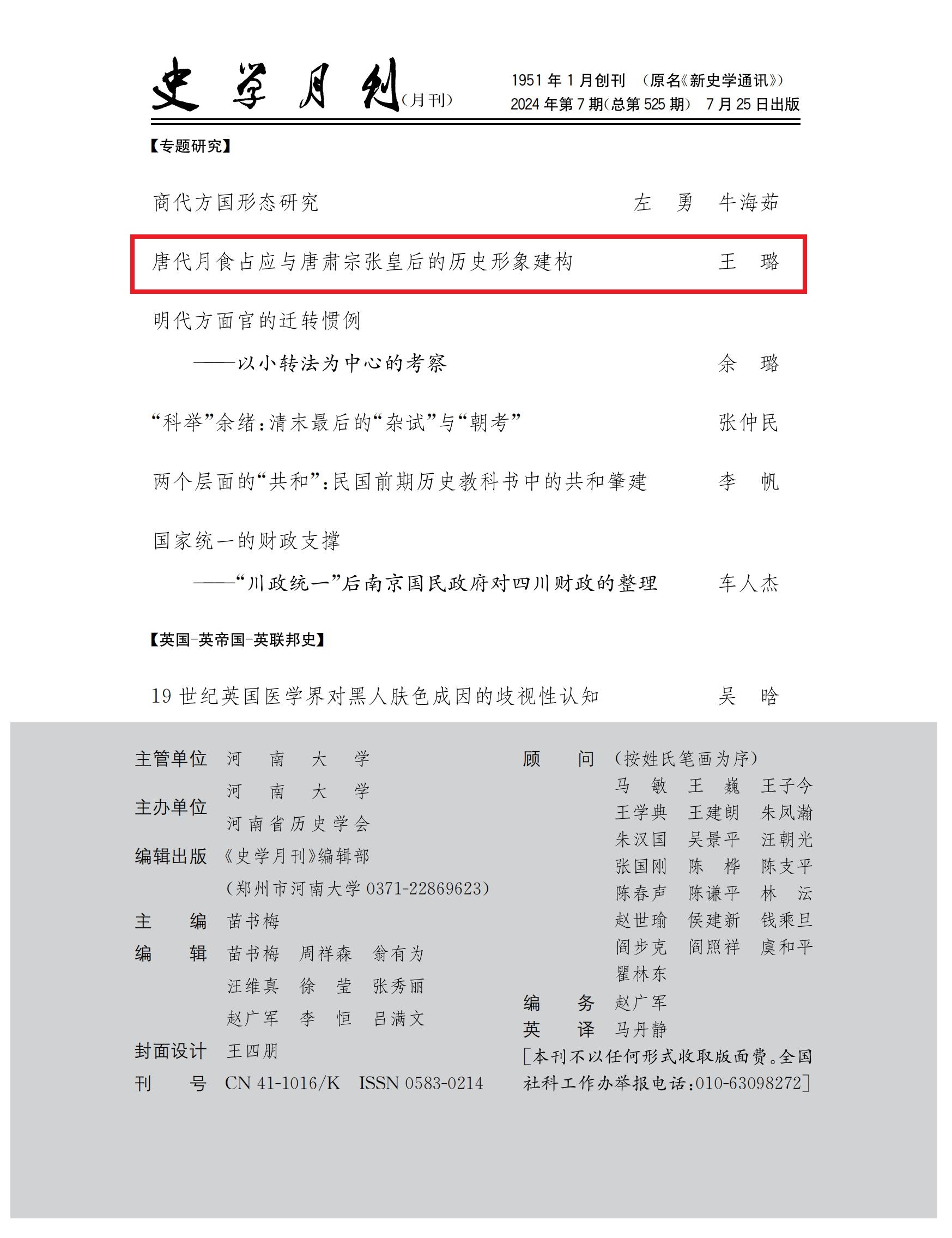 近日,新葡萄8883官网AMG2020级博士研究生王璐在权威期刊《史学月刊》2024年第7期发表题为《唐代月食占应与唐肃宗张皇后的历史形象建构》的论文。