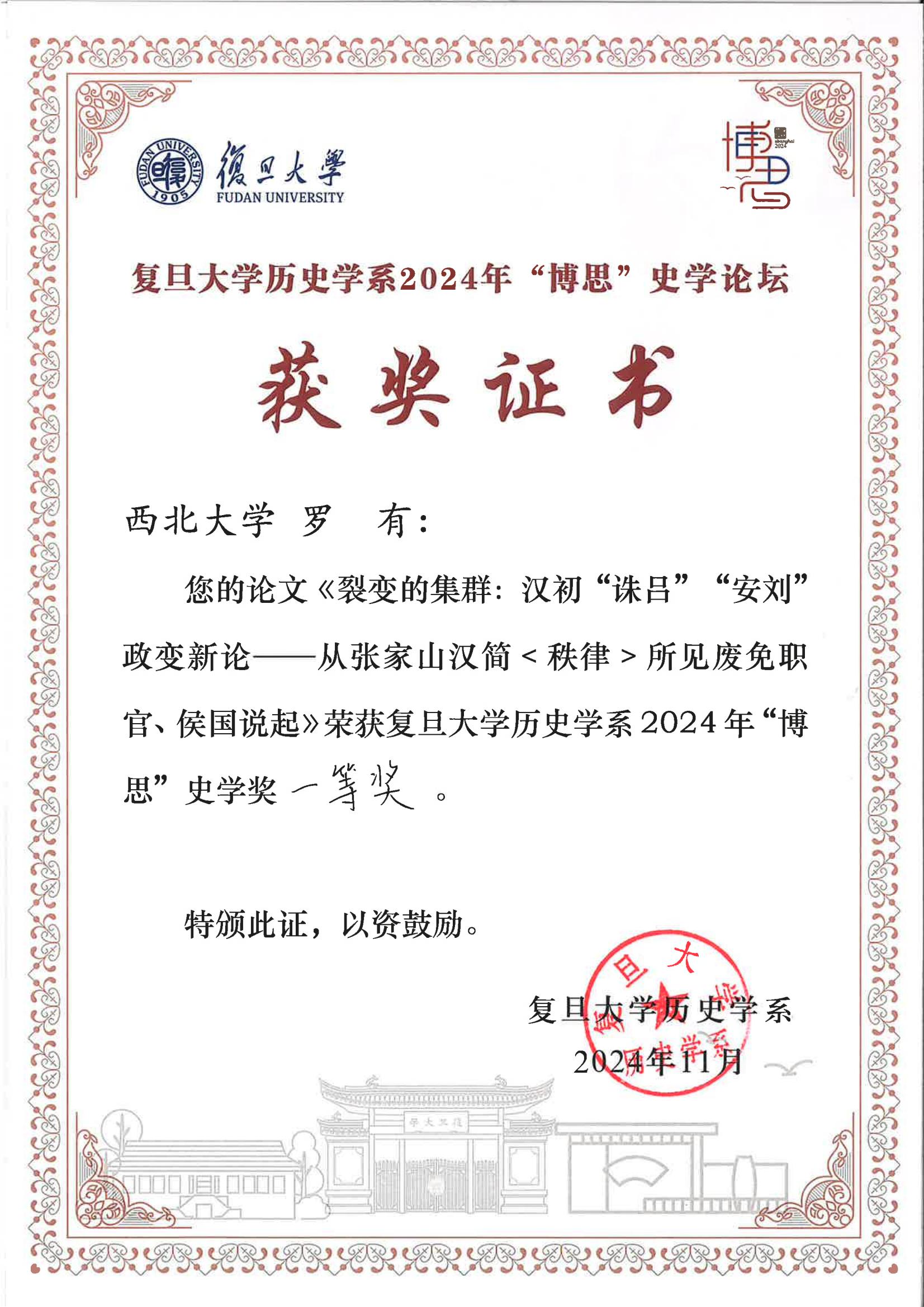 近日,复旦大学历史学系主办的2024年“博思”史学论坛在上海顺利举办。本次论坛吸引了来自全国各地的众多本科生、硕士生和博士生踊跃参与,竞争异常激烈。经过四轮严格评审,从654篇投稿中最终遴选出61篇论文入围。新葡萄8883官网AMG博士生罗有以《裂变的集群:汉初“诛吕”“安刘”政变新论——从张家山汉简〈秩律〉所见废免职官、侯国说起》一文在论坛中脱颖而出,荣获“中国古代史组”一等奖。复旦大学“博思”史学奖自设立以来,旨在为优秀历史学青年学子搭建分享学术创见、展示研究成果、探讨前沿议题的平台。此次获奖展现了新葡萄8883官网AMG研究生过硬的专业素养,也充分体现了新葡萄8883官网AMG一贯重视研究生教育、持续致力于提升学生科研与实践能力的良好成效。