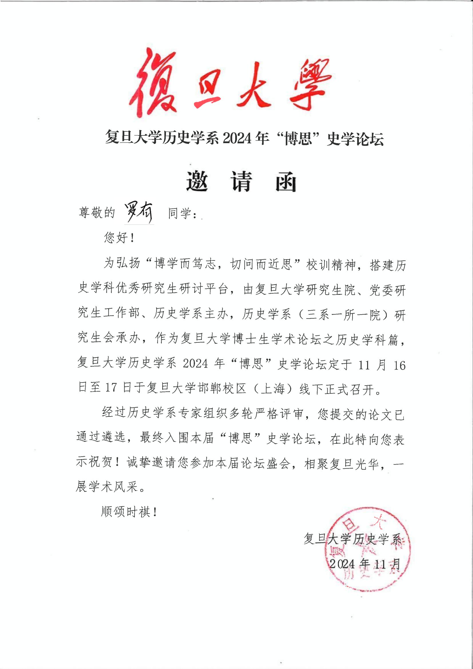 新葡萄8883官网AMG博士生罗有荣获2024年“博思”史学论坛“中国古代史组”一等奖