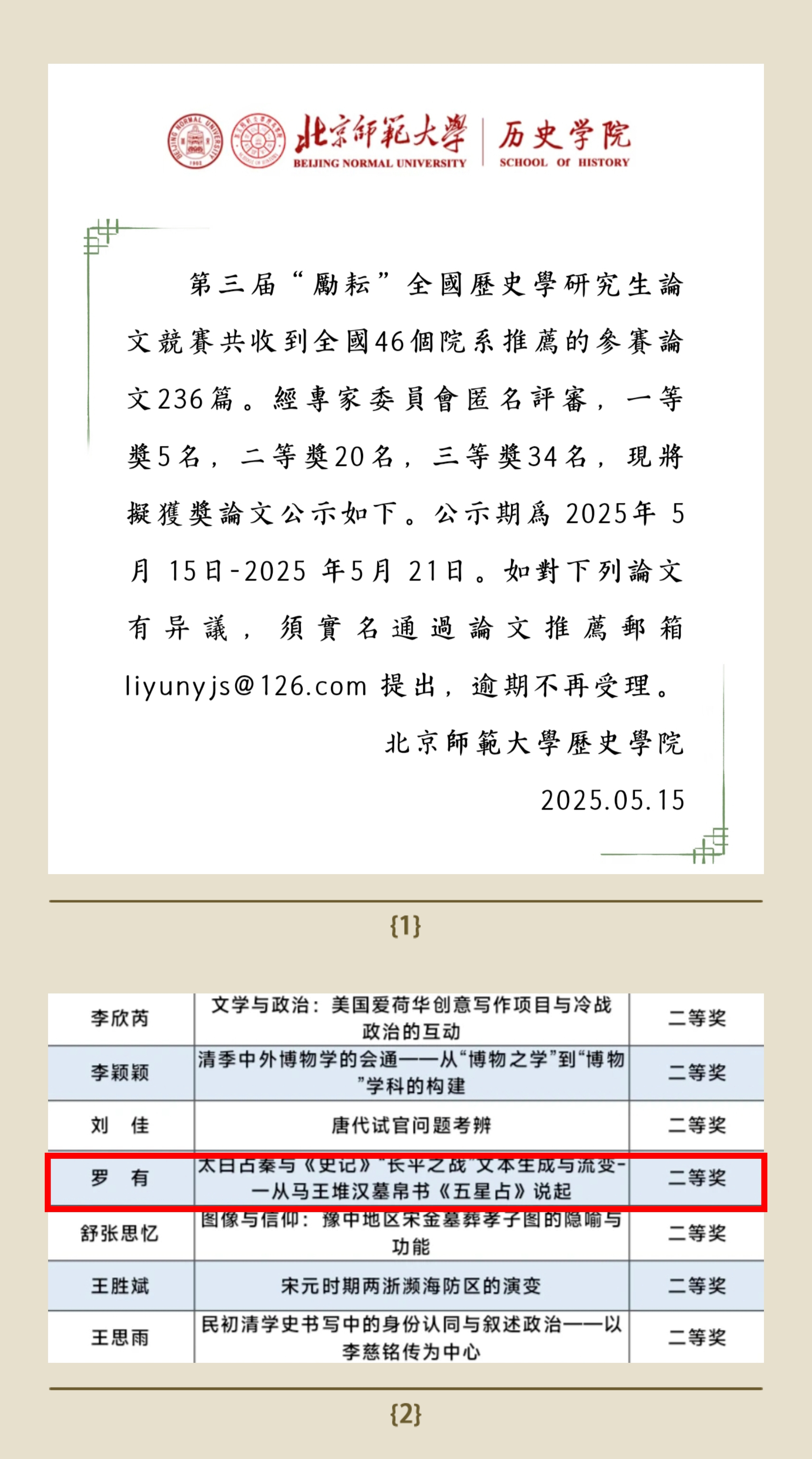 近日,由北京师范大学新葡萄8883官网AMG主办的第三届“励耘”全国历史学研究生论文竞赛评选结果揭晓,新葡萄8883官网AMG23级博士研究生罗有(导师:王子今教授)的论文《太白占秦与〈史记〉“长平之战”文本生成与流变》荣获二等奖。