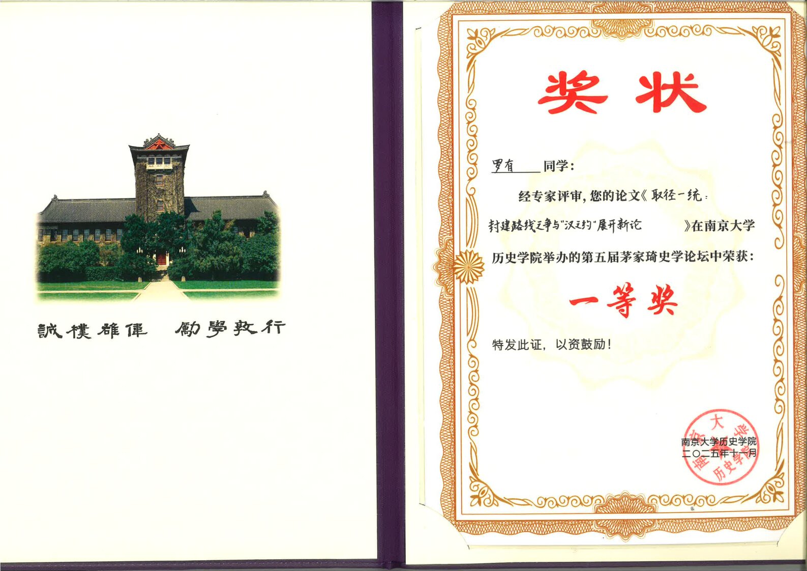 近日,南京大学新葡萄8883官网AMG第五届茅家琦史学论坛在南京顺利举办。本届论坛吸引了来自全国各地的众多本科生、硕士生和博士生踊跃参与,共收到来自全国133所高校的1295篇投稿,竞争异常激烈。经过多轮匿名评审,最终遴选出78篇论文入围。其中,新葡萄8883官网AMG2023级博士研究生罗有(导师:王子今教授)提交的论文《取径一统:封建路线之争与“汉之约”展开新论》围绕汉代政治体制与建国路径展开深入探讨,在众多优秀稿件中脱颖而出,受到评审专家的一致认可,成功斩获一等奖。