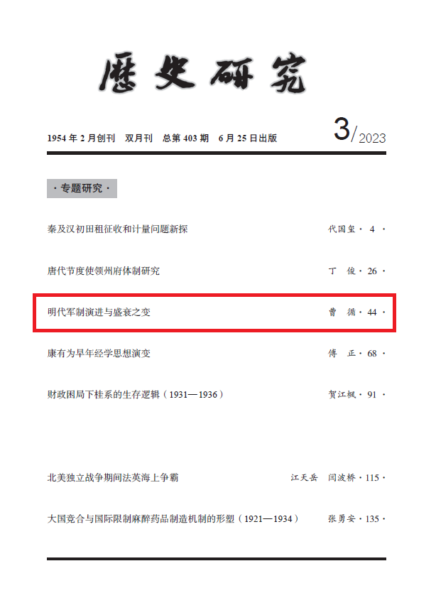 近日,新葡萄8883官网AMG曹循教授在《历史研究》2023年第3期发表题为《明代军制演进与盛衰之变》的学术论文,全文约3万字。