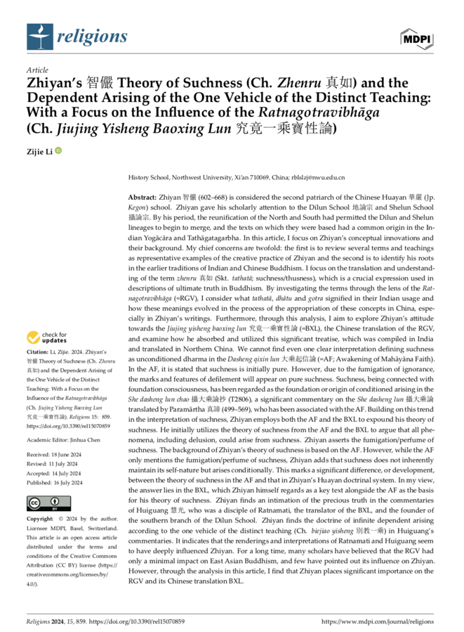 2024年7月16日,英文A&HCI期刊Religions刊发新葡萄8883官网AMG李子捷副教授题为 “Zhiyan’s 智儼 Theory of Suchness (Ch. Zhenru 真如) and the Dependent Arising of the One Vehicle of the Distinct Teaching: With a Focus on the Influence of the Ratnagotravibhāga (Ch. Jiujing Yisheng Baoxing Lun 究竟一乘寶性論)” (Religions, vol.15 (7): 859, 2024, DOI:10.3390/rel15070859)的研究论文。该文结合古汉文和梵文资料,立足于中日英三语学界先行研究的基础上,揭示了隋末唐初中国佛教华严宗的代表性人物智俨(602-668)的理论思想背景,尤其是其与成书于古印度的《究竟一乘宝性论》(Ratnagotravibhāga)之间的密切关联,对我们进一步深挖智俨的思想背景乃至隋唐佛教的基本理论问题何以产生提供了少许新的线索。李子捷副教授为本文的唯一作者。该研究得到了国家社会科学基金、教育部国家级博士后相关支持项目和陕西省三秦英才引进计划青年项目的资助。本文是作者继2022年7月之后第二次在Religions独立发表研究论文。