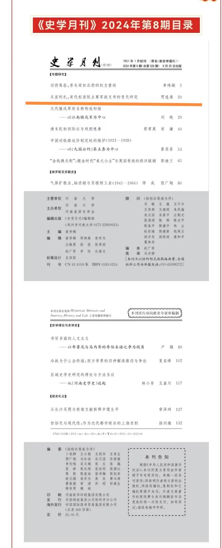 近日,新葡萄8883官网AMG贾连港副教授在《史学月刊》2024年第8期发表了题为《从宣到札:宋代枢密院主要军政文书的变化研究》的专题论文。