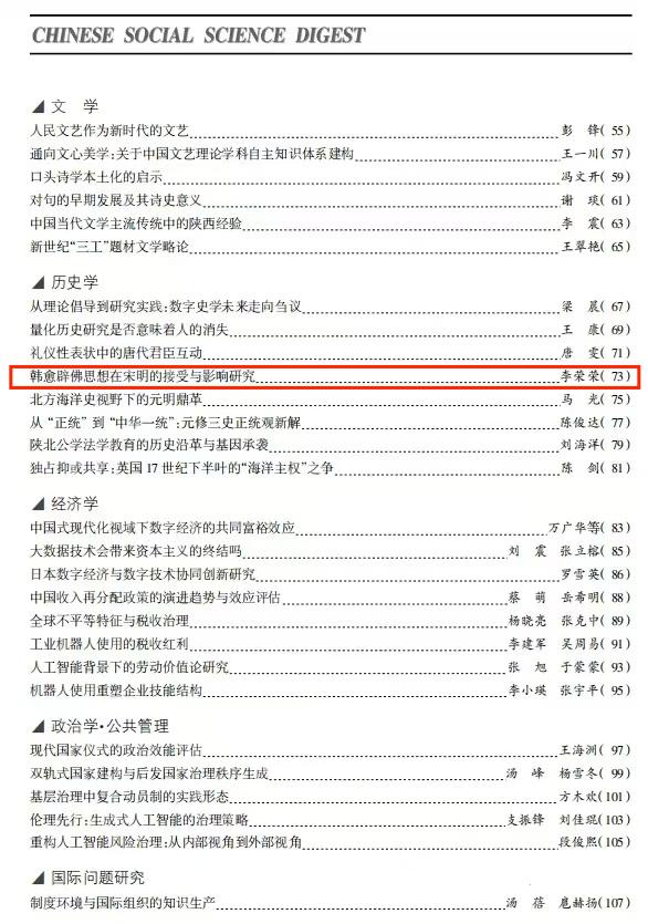 近日,新葡萄8883官网AMG2020级博士李荣荣《韩愈辟佛思想在宋明的接受与影响研究》一文,被《中国社会科学文摘》2024年第10期转载。(原载于《中国思想史研究》2024年第1辑)