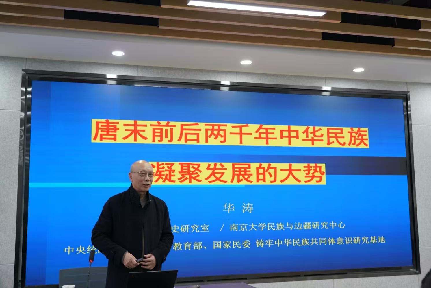 华涛先生首先回顾了南京大学元史研究室和我校著名学者侯外庐先生、马长寿先生的渊源,在分析了“民族”和“中华民族”两个概念提出的学术史后,指出需要认识费孝通先生提出的中华民族“多元一体”的背景是汉民族起凝聚作用和各民族存在多层认同;唐朝形成了高度发达和相对统一的华夏—汉文化和作为中华民族凝聚核心的汉族。随后对唐后千年民族凝聚和发展的特点、辛亥革命后各方人士有关统一多民族国家观念的演化以及蒙古族和回族的中华民族认同意识的发展情况进行了阐述。华涛先生指出只有充分理解中华民族发展的复杂性才能从学理上理解“铸牢中华民族共同体意识”这一伟大议题的核心——“认同感”和“凝聚力”
